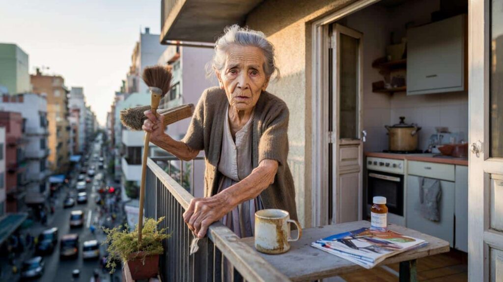 On that balcony stands a woman with silver hair pinned into a stubborn bun, working like she still has a bus to catch.