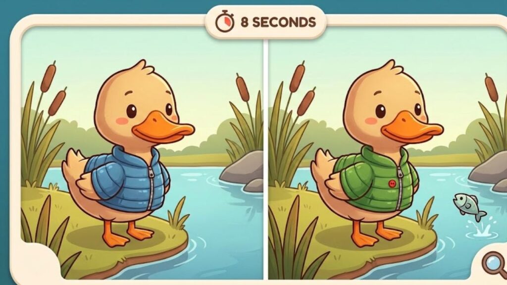 If you enjoy optical illusions and the thrill of a clever brain teaser, today’s challenge is made for you. We’ve put together an engaging Spot the Difference puzzle designed to test your observation skills and quick thinking. The visual features a cheerful duck wearing sunglasses and a stylish jacket as it strolls beside a calm pond. At first glance, the two images look almost identical. However, three subtle differences are hidden within them. Can you find all of them in just 8 seconds? Only truly sharp eyes succeed.