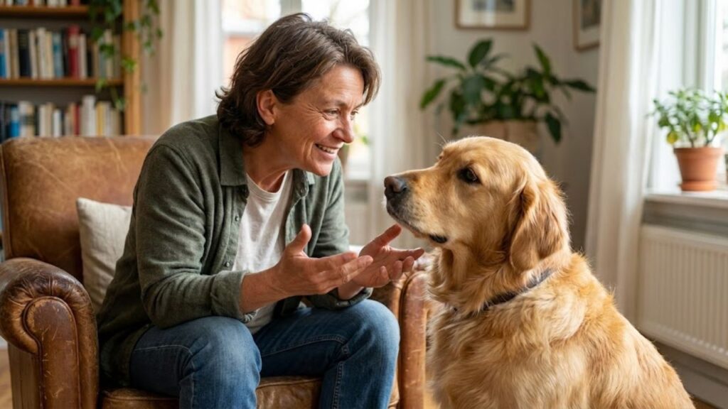 While describing their day to a pet, attention often shifts to physical sensations like warmth, sound, and rhythm. Distractions fade, even briefly.