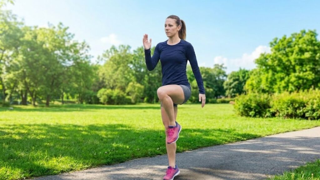 - Lift your left knee to hip height while swinging your right arm forward and left arm back, keeping your core engaged.