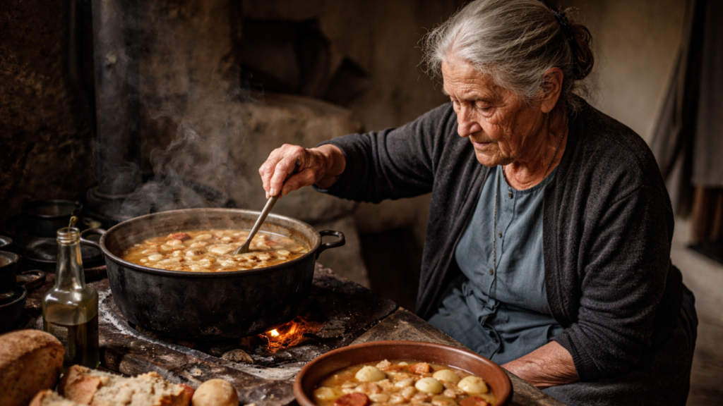 The term “hot gazpacho” may be misleading for those familiar only with the chilled summer drink. In this case, “gazpacho” referred to a rustic, bread-thickened soup born out of necessity and creativity, rather than temperature.