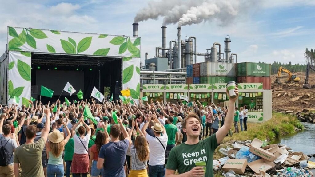 Saturday morning at a zero-waste market. Canvas tote bags, bamboo toothbrushes, and a coffee cart proudly serving oat milk in compostable cups. The air carries the scent of roasted beans mixed with a quiet sense of moral victory. You stand in line for a “planet-positive” latte, feel a small thrill when the barista praises your reusable mug, and glance around at logos pledging carbon neutrality by 2030.