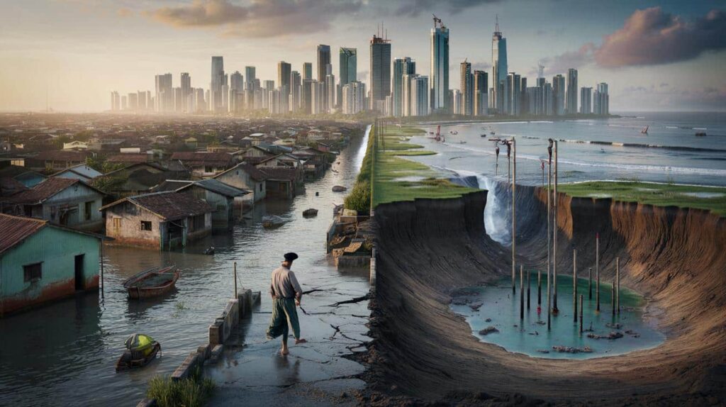 The street in North Jakarta smells faintly of salt and gasoline. At the edge of a battered concrete seawall, fisherman Arif squints at a new crack that wasn’t there last month. Behind him, a skyline of towers leans a fraction closer to the sea each year, like a city caught mid-sigh. His house has flooded three times this season, and the water is coming faster, higher, stranger.