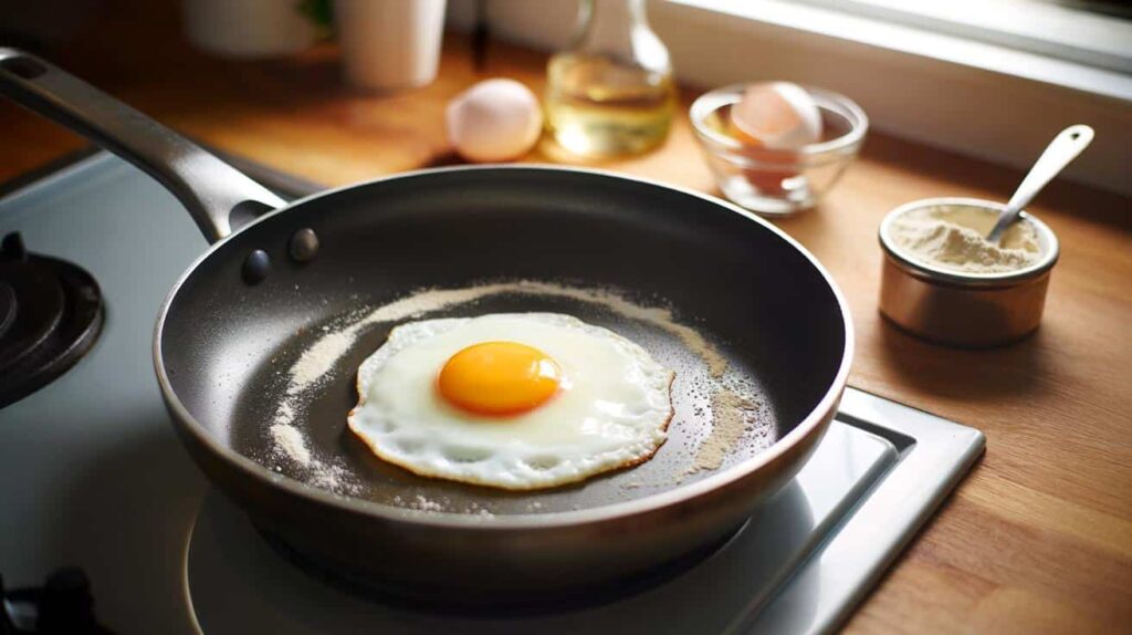 The flour particles sit between the pan and the egg white. They disrupt the direct contact that would normally let the proteins latch on. As the egg cooks, the flour toasts slightly, creating a dry layer that the egg can rest on instead of fusing to the metal.
