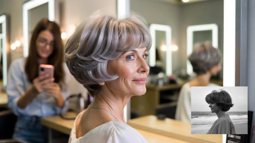 The woman in the hairdresser’s chair is 57, glasses perched on her nose, phone open on a photo from 1967. A black‑and‑white snapshot: her mother, laughing on a beach, hair short, full, with that round volume that screams “sixties”. The client hesitates, touches her own fine hair and asks softly: “Do you think I could wear that now?”