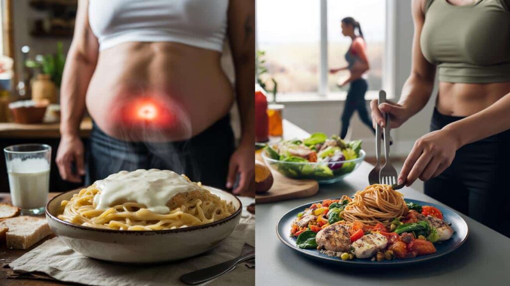 Now shift the same evening slightly. You cook wholewheat or chickpea pasta instead, use a tomato-based sauce loaded with onions, garlic, mushrooms and spinach, drizzle a bit of olive oil and add grated cheese sparingly. Half the plate is vegetables, a quarter is pasta, and the rest is grilled chicken or beans. After eating, you walk around the block for 15–20 minutes.