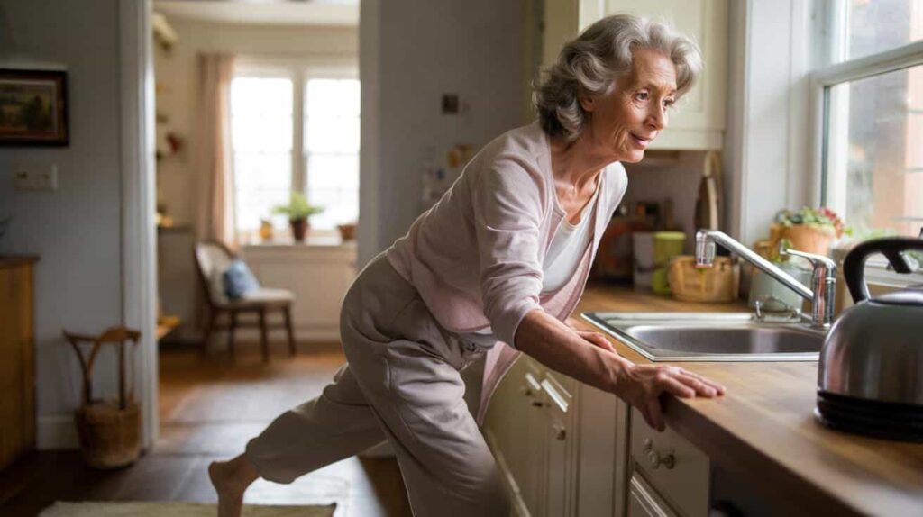 Start with very small doses. Two minutes by the kitchen counter while the kettle boils. A few steps sideways along the hallway, one hand grazing the wall. That’s it for the day.