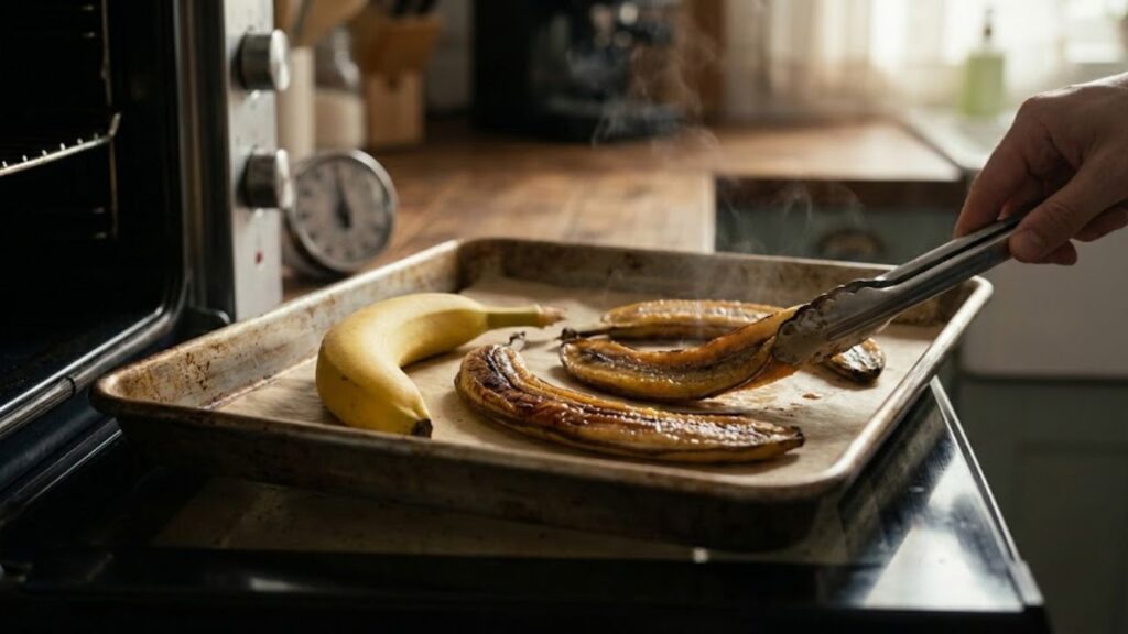 Simply remove the peel from the banana, place it on a baking sheet, and bake at 350°F for 30 minutes until tender.