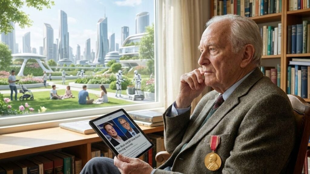 On a gray Tuesday in Stockholm, in a quiet conference room that smells faintly of coffee and cold air, a Nobel Prize–winning physicist leans back in his chair and delivers a thought-provoking prediction: “Your grandchildren,” he says calmly, “will have more free time than any humans in history. They may also never have a job in the way you understand it.”