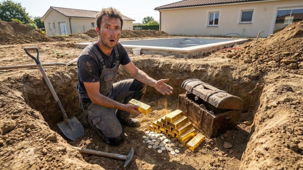 On a quiet residential street in the Rhône, the only sound that morning was the hum of a mini-excavator digging into a dry garden. The homeowner, a man in his fifties, had finally decided to treat his family with a new swimming pool. As the excavator’s bucket carved out the blue rectangle he had dreamed of all winter, nothing remarkable was discovered – just dust, roots, and a few old pipes. But then the machine hit something that rang sharply. The driver paused, assuming it was just a rock or an old concrete slab. When he jumped down to investigate, he uncovered a metal corner. A lid soon emerged. For a few moments, no one spoke. Inside the metal box lay gold bars and coins, valued at roughly €700,000. What started as a pool hole had unexpectedly become a treasure hole. And that’s when the real trouble began.