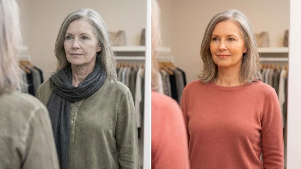 Picture a familiar scenario: a person in their late fifties wearing a grey suit and black turtleneck under low indoor light. The cool, dark palette mirrors under-eye shadows. Replace the black with a soft ivory top and add a teal accent, and the same face often looks immediately more awake.