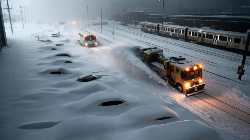 At first, the photos look beautiful. A white curtain over neighborhoods, rail yards dusted with frost, highways turned into silent rivers of snow. Then you notice the small details that tell a different story. The snow banks already level with parked cars. The plow blades sparking as they grind over buried curbs. The bus stuck diagonally in the middle of the road, hazard lights blinking into a wall of white.